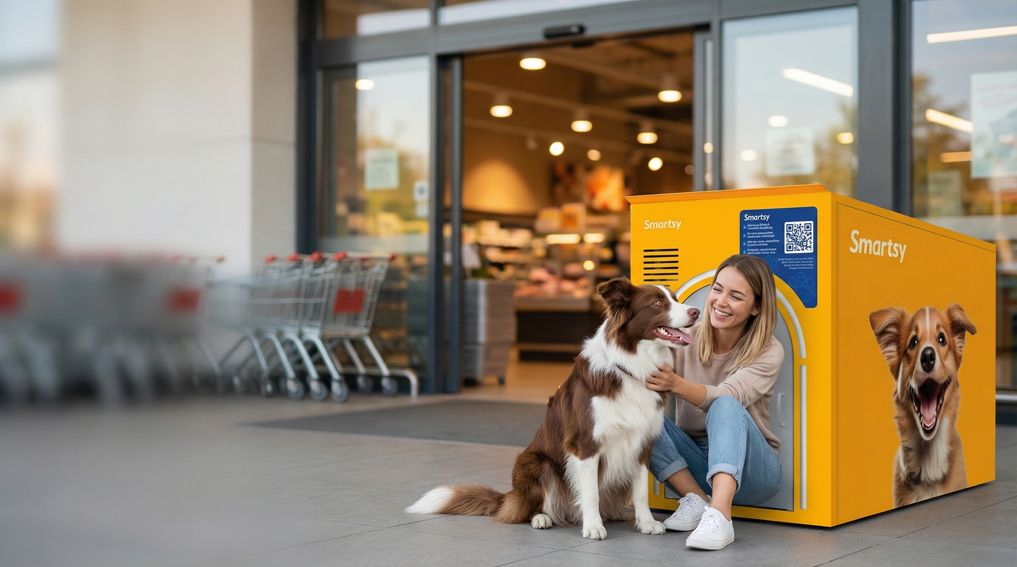 Smartsy ist ein intelligentes, sicheres, klimatisiertes Hundehäuschen, das für Eingänge von Geschäften entworfen wurde – damit Ihr pelziger Freund sicher bleibt, während Sie in Ruhe einkaufen.